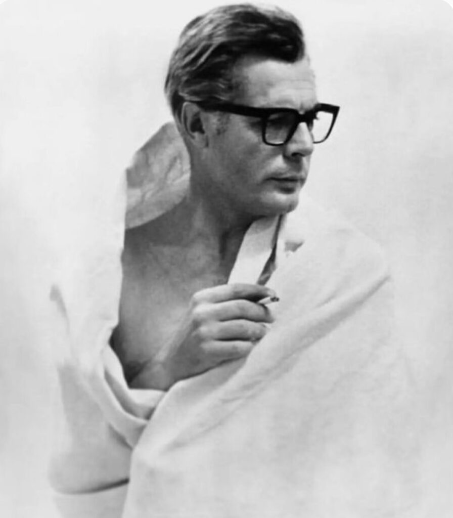 Marcello Mastroianni házikabátjában belépett a kis szalonba, miután kissé teátrális módon belökte a kétoldalra nyíló, a szeparét a lakás további részétől elválasztó ajtót és böfögött egy egészségeset. A kezében tartott cigarettáról lehullott egy adag hamu a parkettára, Mastroianni fekete keretes szemüvege mögül körbenézett a társalgónak nevezett, esetünkben síri csend uralta térben. Fogalmam sincs észlelte-e , hogy ott ülök és épp rá várok. Ezután sarkon fordult és elindult vissza arrafelé, ahonnan belépett a kis vendégfogadó szalonba. Lépett párat majd pontosan a ajtó küszöbének vonalában megállt. Na, akkor most fog visszafordulni és észrevenni, gondoltam és, hogy akkor ezzel a teátrális bár meghökkentő belépővel meg is adtuk a művészi lét érthetelenségének ami jár. De Mastroianni testsúlyát a bal lábára helyezve, csípőjét kicsit kitolva, a papucsos jobb lábát kicsit megemelve fingott egy óriásit. Majd lendületet véve kilépett a térből és távozott.