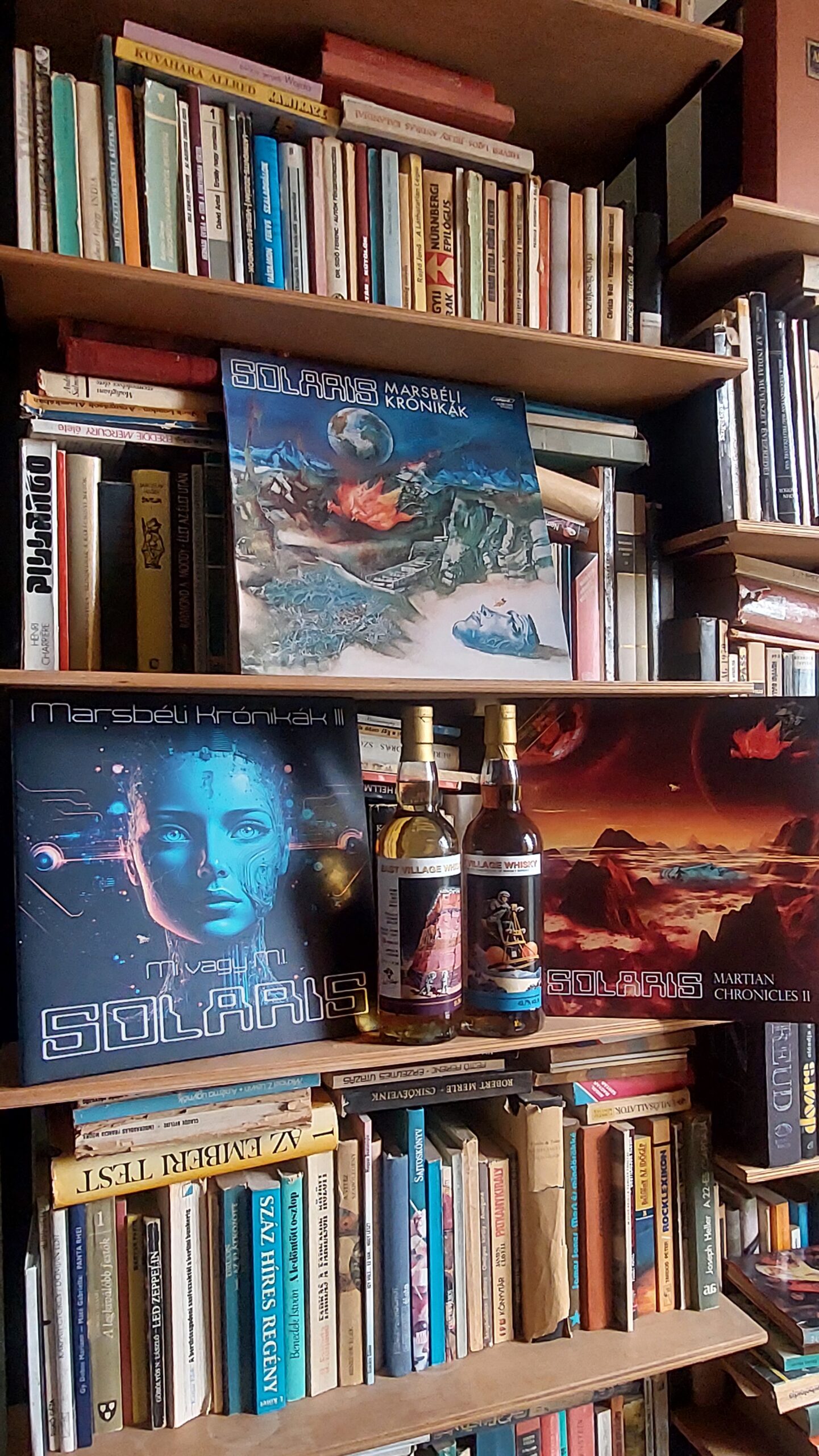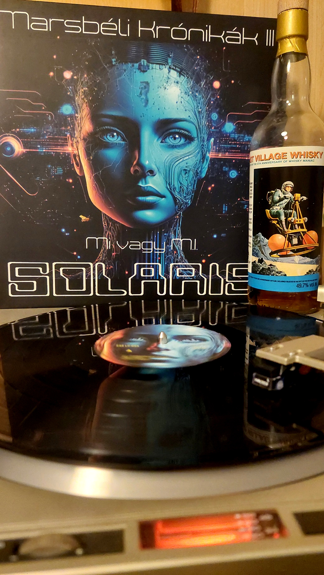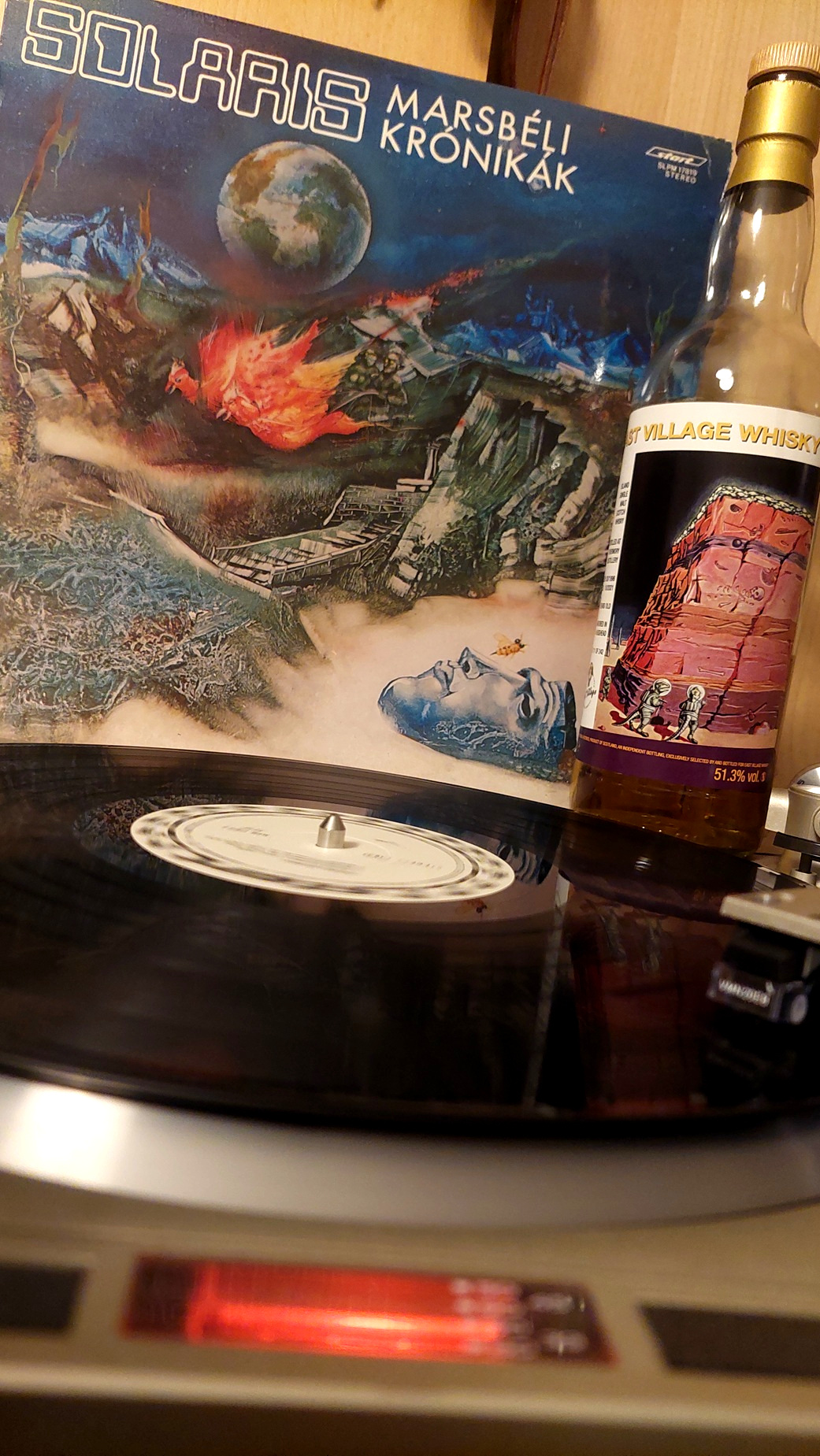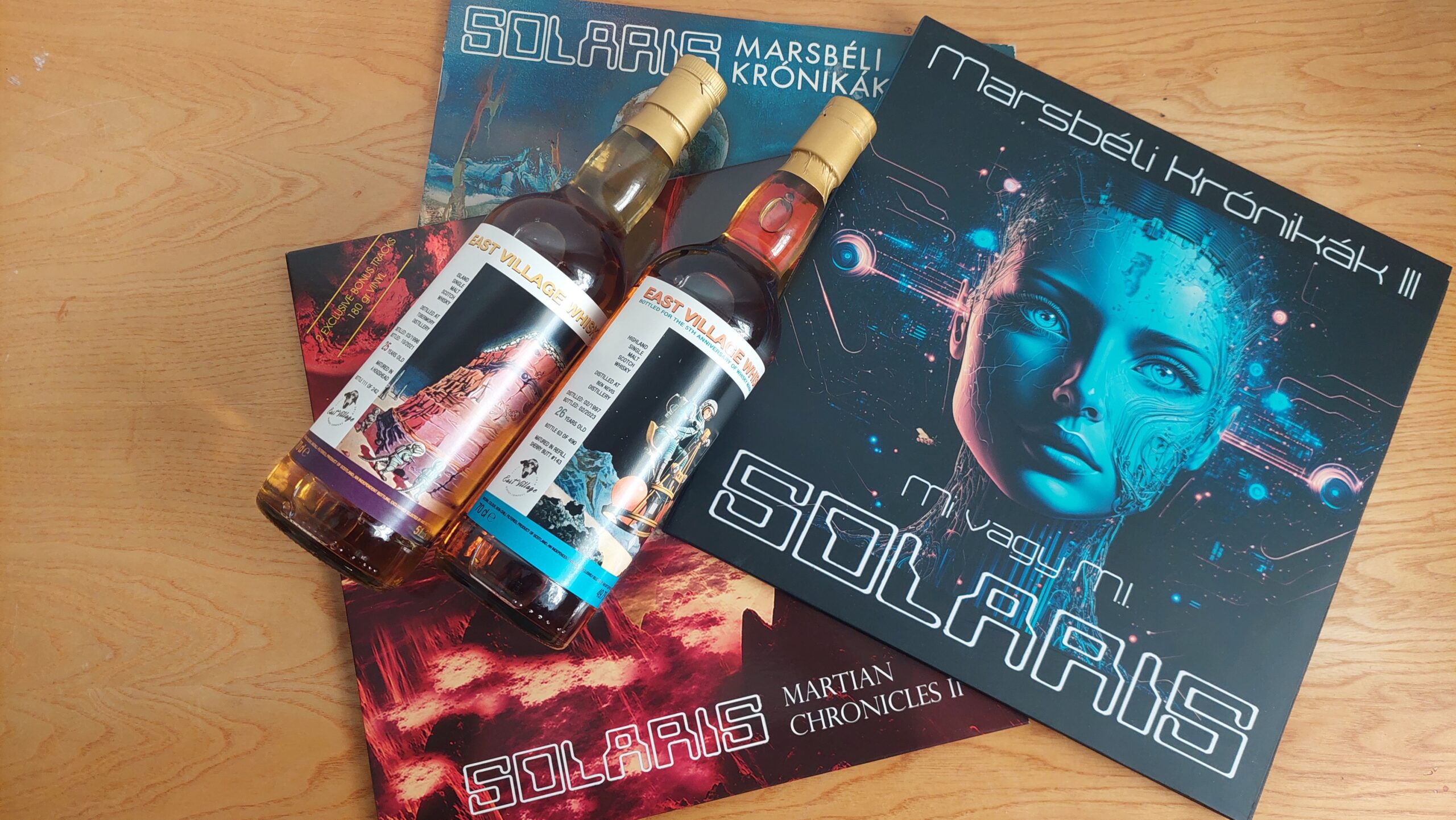 Tavaly év végén, 2024-ben megjelent a Solaris együttes harmadik Marsbéli Krónikák nagylemeze. Negyven éves jubileumi kiadás. Két példányt is vásároltam, és a hozzá tartozó sci-fi füzeteket is, amiket a zenekar elkötelezett tudományos-fantasztikus irodalom rajongója és billentyűse, Erdész Róbert írt. A három kis novella a lemezen lévő számokhoz illeszkedik. Már akkor elhatároztam, hogy erről írni fogok, erről írnom kell. Valahogy adta magát, hogy összekössem a Dramazinnal, a whiskyvel, az újraindított Zenegép rovat kiáltott érte. Sokat gondolkodtam, hogy mi legyen a hozzá társított ital, végül a cimke adta meg a választ. A polcomon üldögélő, méregdrága huszonhat éves Ben Nevis, egy űrbéli tájon repülő, apró szerkezeten billegő szkafanderes asztronautával idézi meg a retro sci-fi hangulatot. Ez volt az eredeti ötlet, amin jó hosszan ültem, több mint egy év kiszaladt a főkönyvemből. Az elszámolás darabra megvan, mégis csodálkozom olykor rajta. Annyi azért történt a sok ledolgozott munkanapon, a sok autópályán megtett kilométeren, a sok feldolgozott élelmen túl, hogy vásároltam ugyanettől a palackozótól egy huszonöt éves bourbon érlelt Tobermory-t, ami szintén egy ropogós sci-fi témájú cimkével büszkélkedhet. Talán rá vártunk, hogy megtartsuk a bulit.