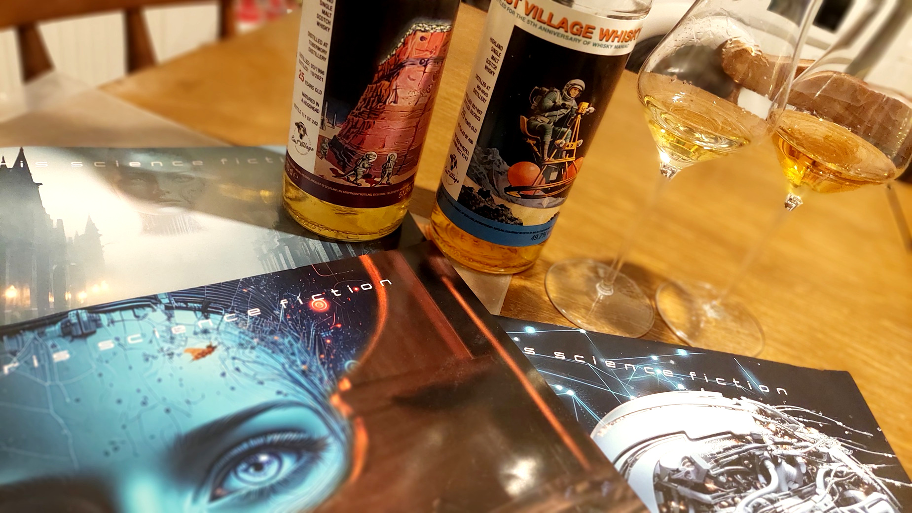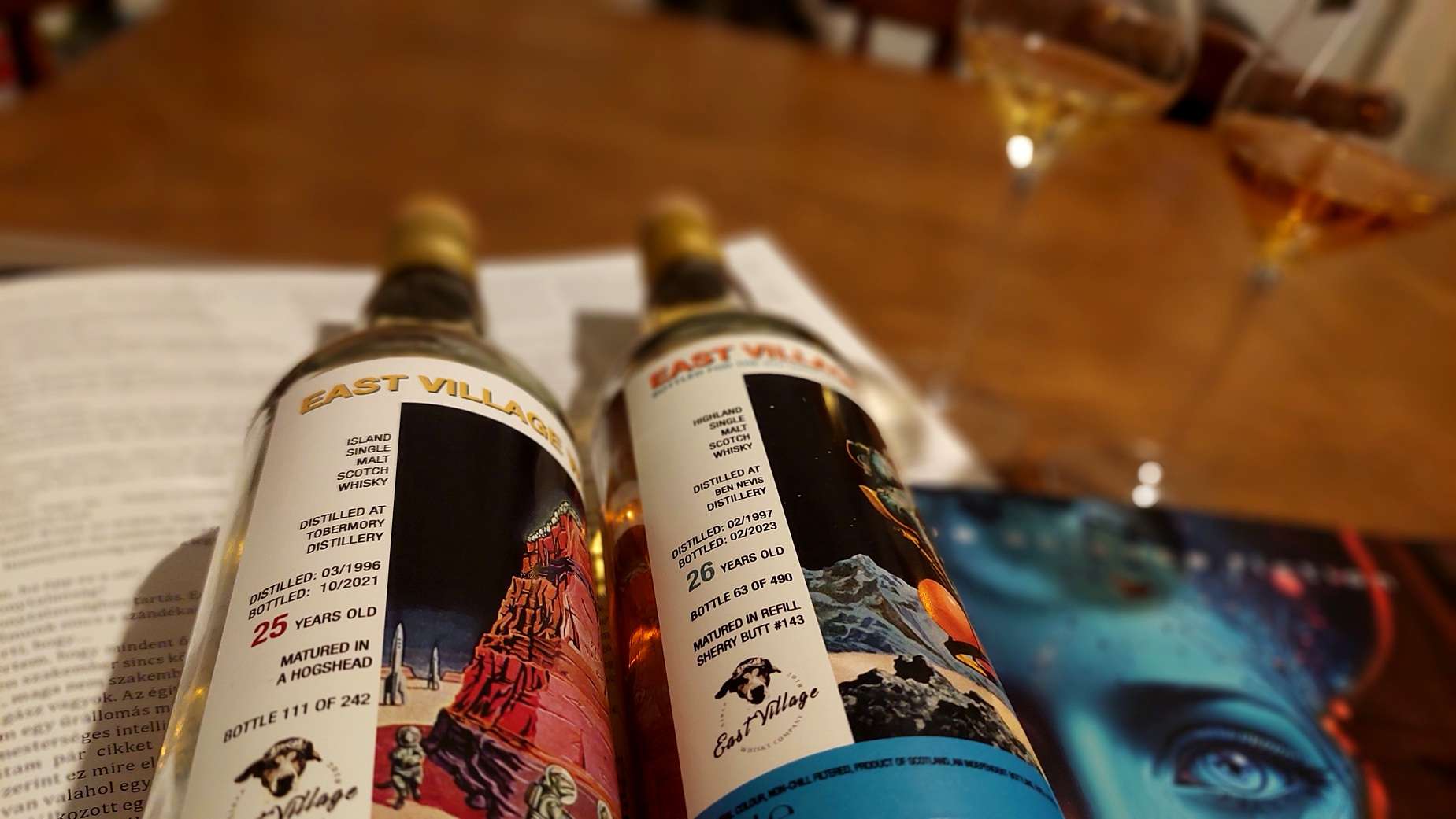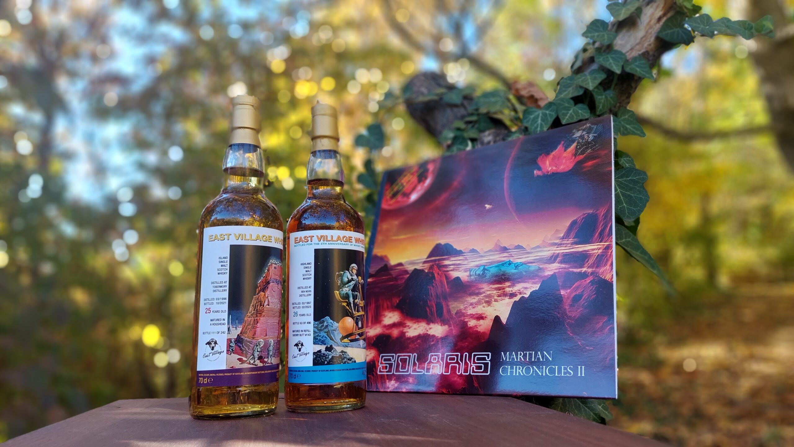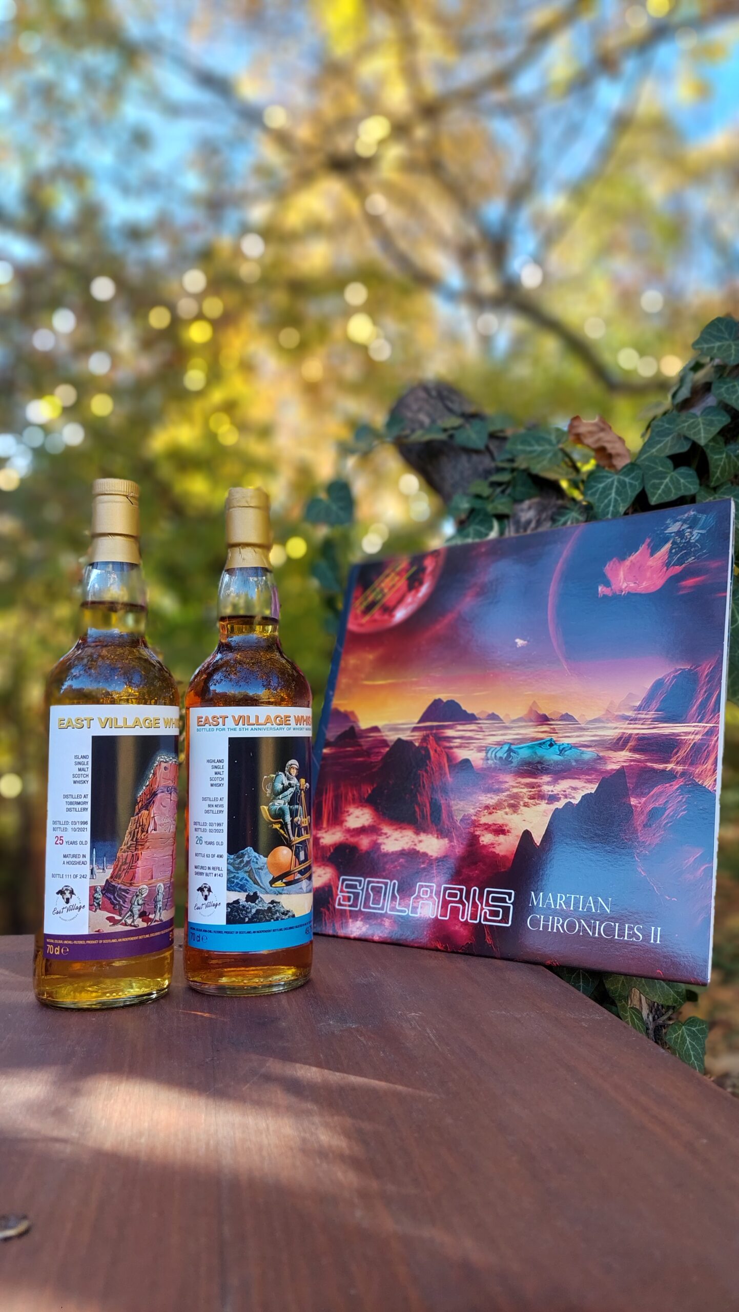 Tavaly év végén, 2024-ben megjelent a Solaris együttes harmadik Marsbéli Krónikák nagylemeze. Negyven éves jubileumi kiadás. Két példányt is vásároltam, és a hozzá tartozó sci-fi füzeteket is, amiket a zenekar elkötelezett tudományos-fantasztikus irodalom rajongója és billentyűse, Erdész Róbert írt. A három kis novella a lemezen lévő számokhoz illeszkedik. Már akkor elhatároztam, hogy erről írni fogok, erről írnom kell. Valahogy adta magát, hogy összekössem a Dramazinnal, a whiskyvel, az újraindított Zenegép rovat kiáltott érte. Sokat gondolkodtam, hogy mi legyen a hozzá társított ital, végül a cimke adta meg a választ. A polcomon üldögélő, méregdrága huszonhat éves Ben Nevis, egy űrbéli tájon repülő, apró szerkezeten billegő szkafanderes asztronautával idézi meg a retro sci-fi hangulatot. Ez volt az eredeti ötlet, amin jó hosszan ültem, több mint egy év kiszaladt a főkönyvemből. Az elszámolás darabra megvan, mégis csodálkozom olykor rajta. Annyi azért történt a sok ledolgozott munkanapon, a sok autópályán megtett kilométeren, a sok feldolgozott élelmen túl, hogy vásároltam ugyanettől a palackozótól egy huszonöt éves bourbon érlelt Tobermory-t, ami szintén egy ropogós sci-fi témájú cimkével büszkélkedhet. Talán rá vártunk, hogy megtartsuk a bulit.
